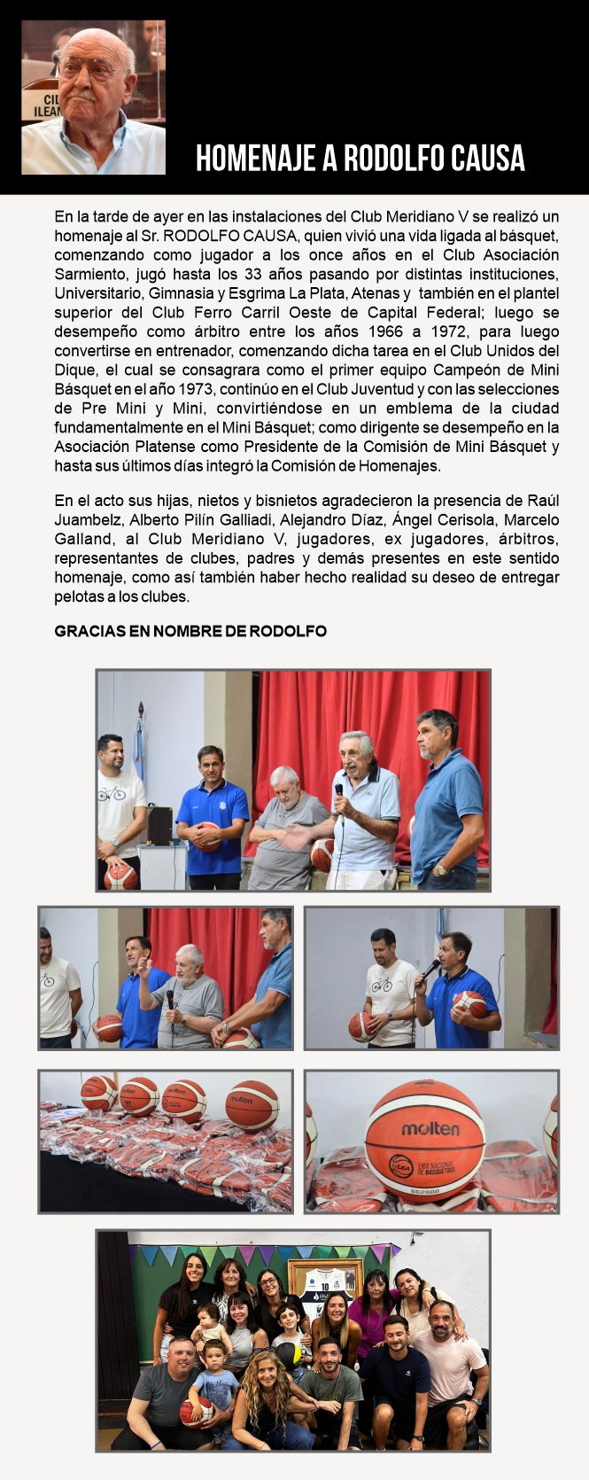 Invitamos a toda la gran familia del basquet platense al homenaje que se realizara a nuestro queridisimo Rodolfo Causa . El mismo se llevara a cabo en el Jardin de Infantes del club Meridiano V 67 / 16 y 17.